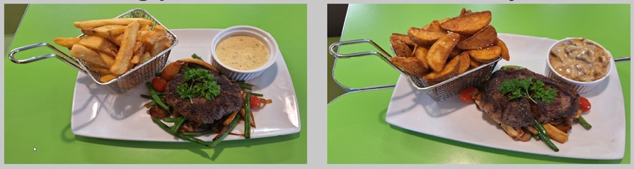Selv Burgere” og serveret pommes fritter med sodavand og slikposer